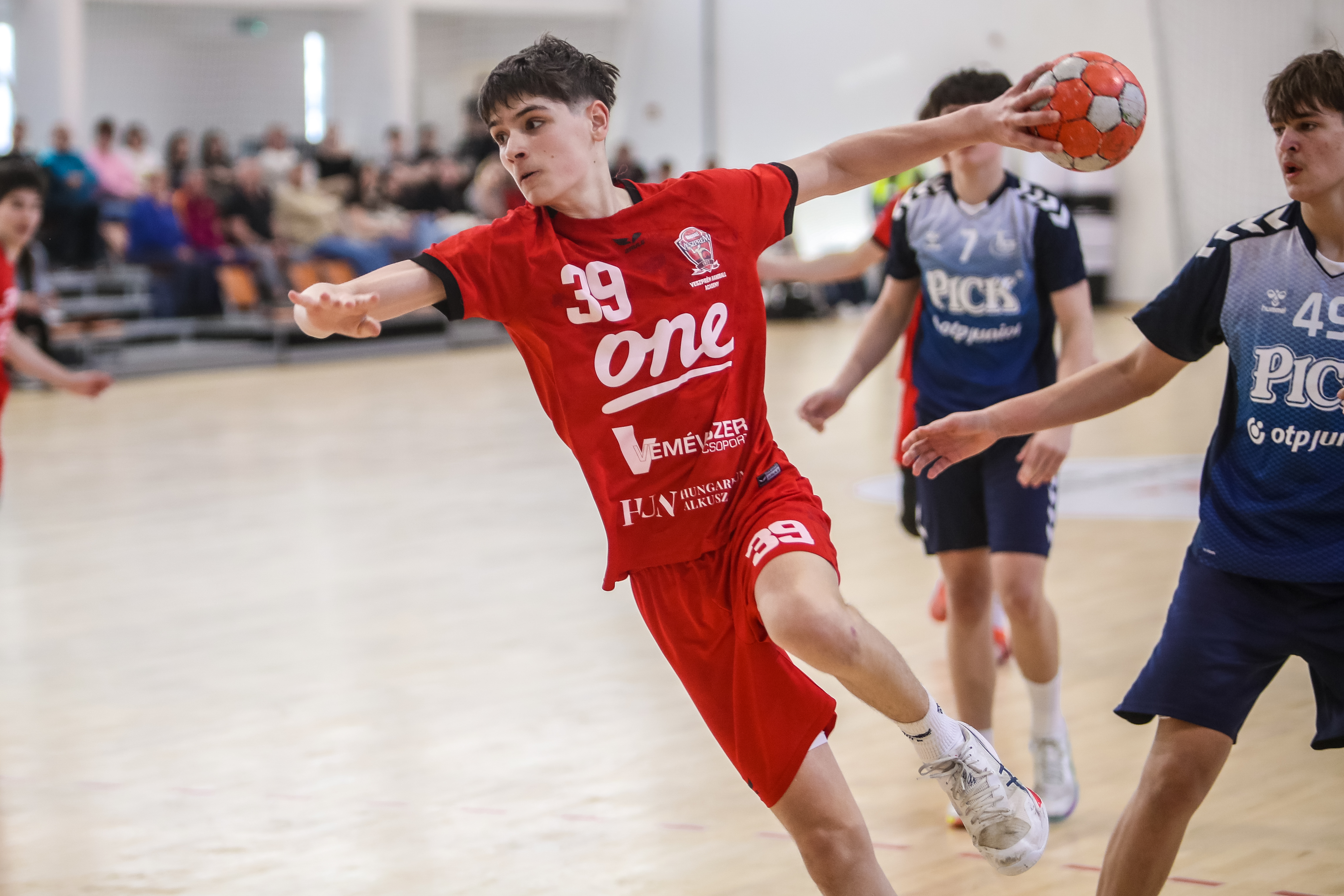 Örökrangadóra telt meg a lelátó a DEVM Csarnokban, az U16 Felsőházában (az I. osztályú bajnokság során idén először) párbajozott az 5. helyen álló csapatunk a jelenlegi listavezető OTP Bank-Pick Szegeddel. A különleges alkalomnak megfelelően a Veszprém piros, a Szeged kék mezben lépett pályára. A hazaiak nyitották a találkozót, kisvártatva Bedenek meg is szerezte a meccs első gólját, de a Szeged sem váratott sokáig az első találatra. A parázs hangulat egyaránt jellemző volt a pályára és a lelátóra is, minden egyes gólt hatalmas üdvrivalgás kísért mindkét oldalról. Az első percekben fej-fej mellett haladtak a csapatok, de két eladott labdából a Szeged rövid időn belül kovácsolt előnyt magának, a 15. percre 6:9-re vezettek, ekkor Virág Sándor felhasználta első időkérését. A támadás végén a labda a kapufáról pattant ki, a Kiskékek újabb találatot húztak be. Bedenek szépítő gólja után hosszú percekig eredménytelenül ostromoltuk a szegedi kaput, a túloldalon viszont további találatokkal nyitották jobban az ollót, a 22. perc elején 7:12-es állásnál két percnyi emberelőnyt nyertünk, Békési pedig hetesből talált be. A létszámfölény további hozadékaként Békési szélről is betalált, majd Ács beállóból faragott a hátrányunkból. A 25. percben 10:12-nél a Szeged kért időt, a támadás során Ács kapott 2 percet, a vendégek pedig újabb gólt szereztek hetesből. A folytatásban Balogh bombájának örülhettünk, majd Novák védett egy kritikus helyzetben, de a Szeged nem engedett a három gólos előnyéből, Békési hetesét is kivédte a kapusuk. A félidő utolsó másodperceiben kétperces kiállítást és hétméterest is kiharcolt Osváth, utóbbit be is húzta, ezzel 12:15 félidei eredménnyel mentek öltözőbe a csapatok.